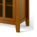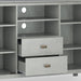 - Features two (2) central drawers with metal glides, open center area with adjustable shelf and two (2) side tempered glass framed doors that open to large storage spaces with two (2) shelves each