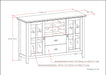 - Features two (2) central drawers with metal glides, open center area with adjustable shelf and two (2) side tempered glass framed doors that open to large storage spaces with two (2) shelves each