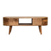 • Mini Rounded Entertainment Unit - This mini solid wood media unit has been constructed from 100% solid mango wood in an oak-ish finish and offers a uniquely shaped design with rounded edges. It features 1 open slot and 2 drawers with shiny knobs and Nordic-style legs. A great simple and addition to the bedroom. This product is part of the Recession Collection.