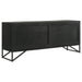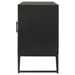 Bold finish composite wood and iron merge to create a stylish and durable four-door accent cabinet. Perfect for use in your dining room, living room, or media room, this chic cabinet is versatile and attractive. Diagonal self-striping adds textured effects on its door fronts to create a compelling look. Find space on two adjustable shelves behind four doors that open with matching black iron vertical pulls. Set atop a geometric black finish iron frame, this cabinet serves as a striking example of bold style.