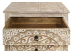 An ornate medallion brings boho charm and artisan character to a farmhouse accent cabinet. Easily doubling as a side table, the cabinet features three drawers perfect for tucking away essentials and accessories in a tidy living area or bedroom. A whitewashed finish complements mango wood, creating depth and dimension for the intricacies of the medallion that spans the drawer fronts. Three bail knobs reinforce a charming look and feel, perfect for complementing Bohemian or maximalist design. Add a funky table lamp or artisan sculpture to complete the look.