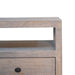 • Artisan Furniture Solid Wood Acid Wash 2 Drawer Open Bedside - This sleek and versatile bedside table offers a perfect blend of functionality and modern design. Made from solid wood, it features a beautiful weathered finish that enhances its natural grain, adding a touch of rustic elegance. The table includes two spacious drawers with smooth black metal knobs for storing essentials, as well as an open shelf that is ideal for displaying books, decor, or a bedside lamp. Its sturdy construction and clean, minimalist lines make it a timeless addition to any bedroom or living space.