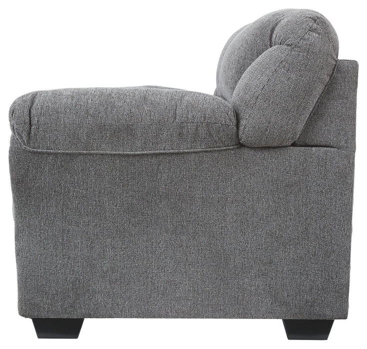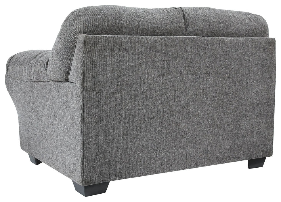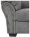 Why sacrifice comfort for style (or style for comfort) when you can have the best of both in this loveseat in pewter gray. Elements include a chic divided-back design and pillow top wrapped armrests that make nodding off all too easy. Calling attention to the elegantly flared armrests—black nickel-tone nailhead trim for a punch of cool character.