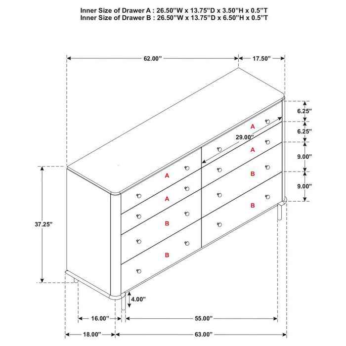 Woven rattan head and footboards create a bold focal point within this four-piece modern bedroom set that includes a nightstand, dresser, and mirror. Its frame finish enhances each piece, offering a distinctive sense of structure that's perfectly augmented with soft, muted gold accents. The nightstand offers three drawers, with felt lining in the top, for bedside necessities and personal items. An eight-drawer dresser also includes felt lining in the top drawers and provides ample space for clothing, linens, and beyond. Drawers are decorated with pairs of ball knobs while rounded corners and decorative legs add dimension and depth to the bed, nightstand, and dresser, and the mirror includes a jewelry tray perfect for delicates, fragrances, and even decor.