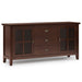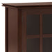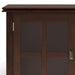 - Transitional Style includes clean angle edged table top, mullion framed tempered glass doors, rectangular antique bronze knobs and square legs