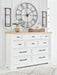 Casual style with substance. This two-tone dresser raises the bar on comfortably cozy design in your soothing sanctuary. A sturdy silhouette with a classic white finish and black metal hardware exudes modern farmhouse vibes. The butcher block oak veneer top adds a relaxed aesthetic. And this charmingly curated piece is spacious enough for all your essentials.