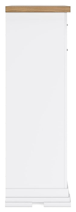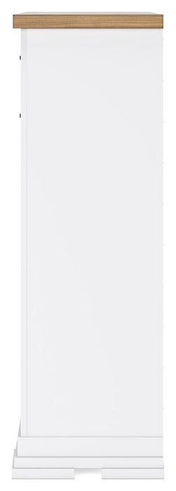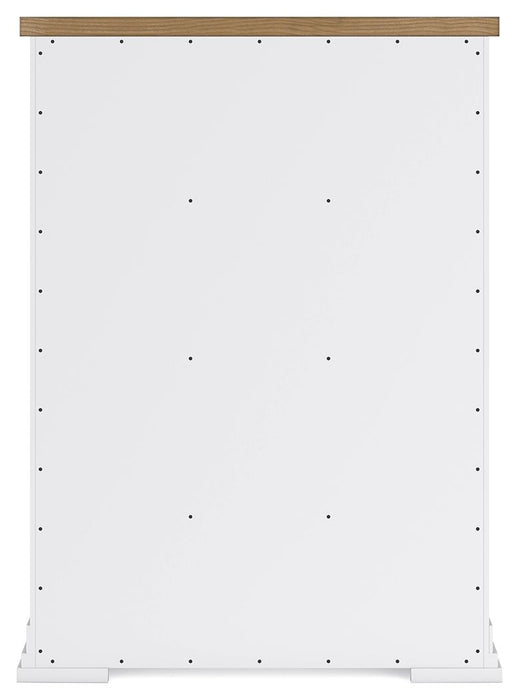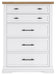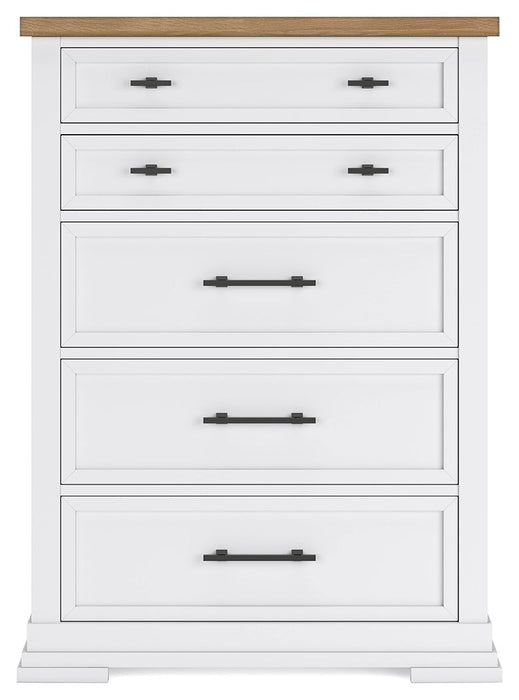 Casual style with substance. This two-tone chest of drawers raises the bar on comfortably cozy design in your soothing sanctuary. A sturdy silhouette with a classic white finish and black metal hardware exudes modern farmhouse vibes. The butcher block oak veneer top adds a relaxed aesthetic. And this charmingly curated piece is spacious enough for all your essentials.