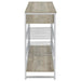 Your entertaining needs are filled with a sense of casual style and supreme organization as this wine cabinet provides space and configuration for a casual space. Make serving a breeze with a cabinet featuring gray finish wood products construction of an upper two-drawer cabinet and matching lower shelf. Minimalist metal framing adds a great optical benefit, with two slat shelves that accommodate dishware and stemware. Drawers open easily to make space for implements. This all-in-one bar cabinet offers a fresh, clean look and lots of convenience to organize an entertainment regimen.