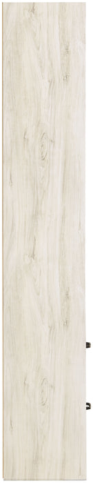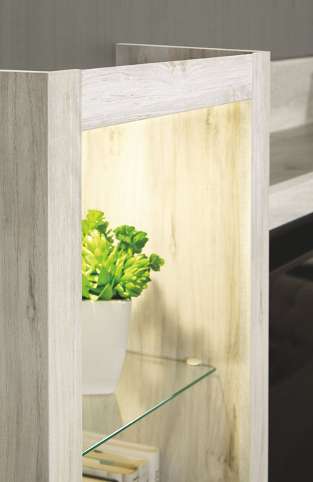 Express your farmhouse style with this TV pier. Its wispy white finish over replicated oak wood grain is a delightful change from the ordinary. Clean-lined styling gives the country chic aesthetic a fresh, contemporary appeal. The reversible door can open left or right with consumer assembly modification.