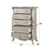 Create the bedroom of your dreams with our Bently chest, which includes a magnificent frame that is adorned with stunning floral and scrolled details. This chest features five ample drawers that will make it convenient for you to keep a clutter-free bedroom. The glides ensure that the drawers open and close smoothly. The beautiful, scalloped edges add refinement and visual interest, and the scroll legs are beautiful and sturdy. The champagne finish is rich and sophisticated.