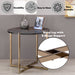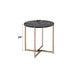 Round, fashionable, and practical. The Bromia end table is a convenient way to add a bit of flair to your home. It is expertly designed with a champagne-colored metal frame, and a black wooden tabletop that ensures it will match any decor style. The tabletop also features a fun metal design to elevate the style.