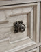 Inspired by the grandeur and grace of European traditional style, this opulent nightstand is nothing short of stunning. Large-scale decorative scrolled pilasters, along with an ash swirl border and walnut inlay crowning the top, are sure to make a sophisticated statement in your restful retreat. The timeless antiqued white coloration and bronze-tone drawer pulls lend an air of subtle elegance to this sumptuous piece. And a hidden pull-out tray keeps your small treasures out of sight.