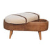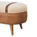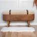 • Tan Buffalo Boucle Nordic Bench - Derived from the French word for 'curled' or 'ringed' yarn or fabric. This piece features a lovely boucle seat made from 100% cotton and natural yarn, it is then complimented by a oval buffallo leather base and straps, for a perfect constrast. It stand on 4 nordic style legs that have an oak-ish finish. This item can be used in the living room or hallway and paired with other boucle or buffallo leather pieces.