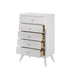 Minimalist and modern, the Cerys chest offers sleek clean lines for a contemporary take. This dresser features five spacious drawers to help you keep an orderly bedroom. Sitting on stylish angled squared wooden tapered legs that provide a modern visual appeal. The white finish makes for the perfect blank canvas for any room.