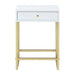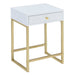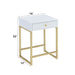Bring the trending contemporary style into your home with this updated Coleen side table. This side table comes with a drawer providing you an additional space to storage. With featuring white top and brass base, this accent piece will be an elegant piece for any decor. Measures 16" x 12" x 22"H. Drawer with side metal glide.