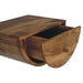 - Solid wood Crescent Floating Nightstand - Introducing our wall-mounted nightstand, a charming addition to your bedroom. With its crescent shape and 1 drawer, it combines elegance and functionality. Crafted from 100% solid mango wood in a oak-ish finish it has a shiny brass knob that adds a touch of sophistication.