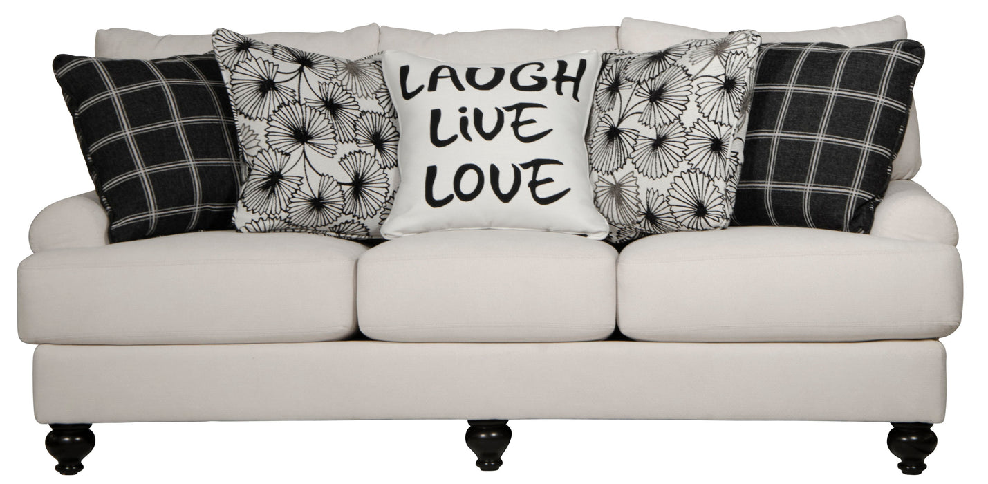 Cumberland is a Farmhouse Casual group with a stylish mix of fabrics and texture. A transitional sock arm, turned wooden legs in a rich finish, and LAUGH-LIVE-LOVE emoji toss pillow complete the look.