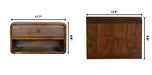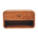 - Curve Upper Slot Floating Bedside - The bigger brother to our original Floating Curve Open Slot Bedside, this minimalistic wall-mounted unit has been constructed from 100% solid mango wood in a finish and features 1 drawer with a shiny knob along with 1 open shelf for storing any bits and pieces you wish to keep close by before bedtime. It's neat and clean design can easily be mounted on the wall without the fuss of any legs. Caution! Do not sit on the unit.