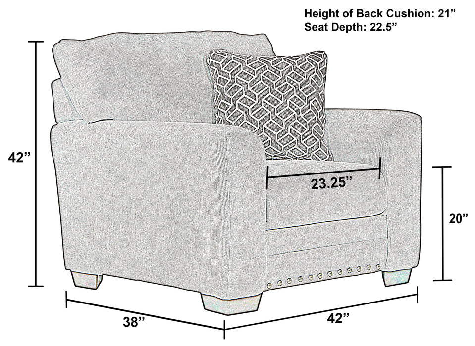The contemporary farmhouse styling of the Cutler chair brings comfort and style to any room. Built for comfort, the seat is constructed of individually pocketed coils encased in foam and topped with a layer of cool gel infused memory foam for a long lasting, comfortable and supportive seat. Covered in a soft, durable 100% polyester body fabric in a light gray color and accented with a coordinating designer toss pillow, the Cutler brings style to any room. The look is completed with pewter finished nailhead accents along the base.