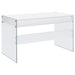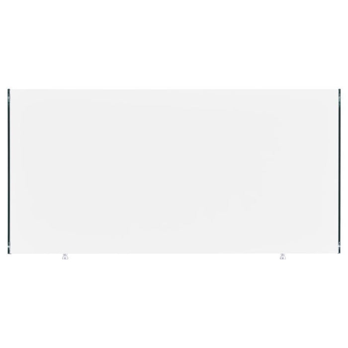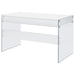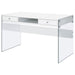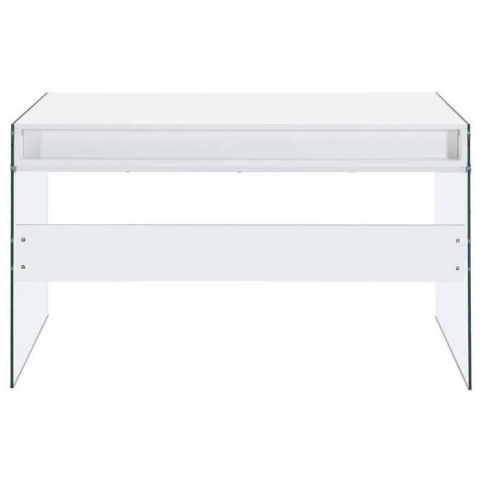 With its cool, contemporary appeal, this versatile writing desk works well in a bedroom or living room. It creates a functional space to work and study without sacrificing style. Bold, thick, tempered glass panels form its base supports, giving it an inspired touch of glamour. This desk is complete with an open center compartment and two drawers, adding extra convenience while maintaining its sleek look.
