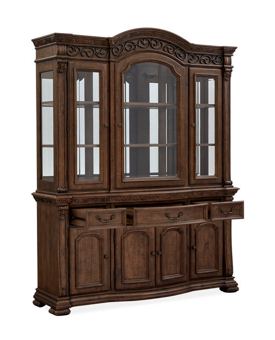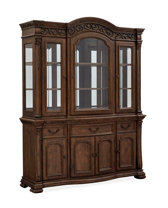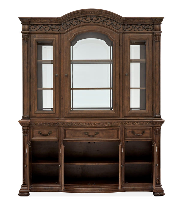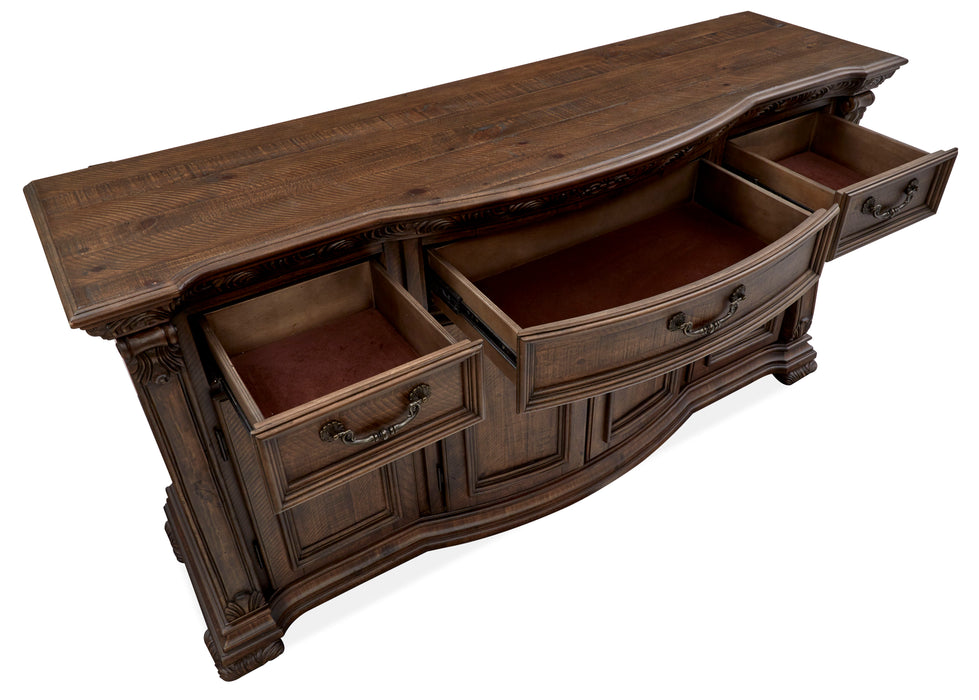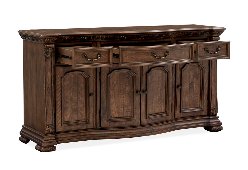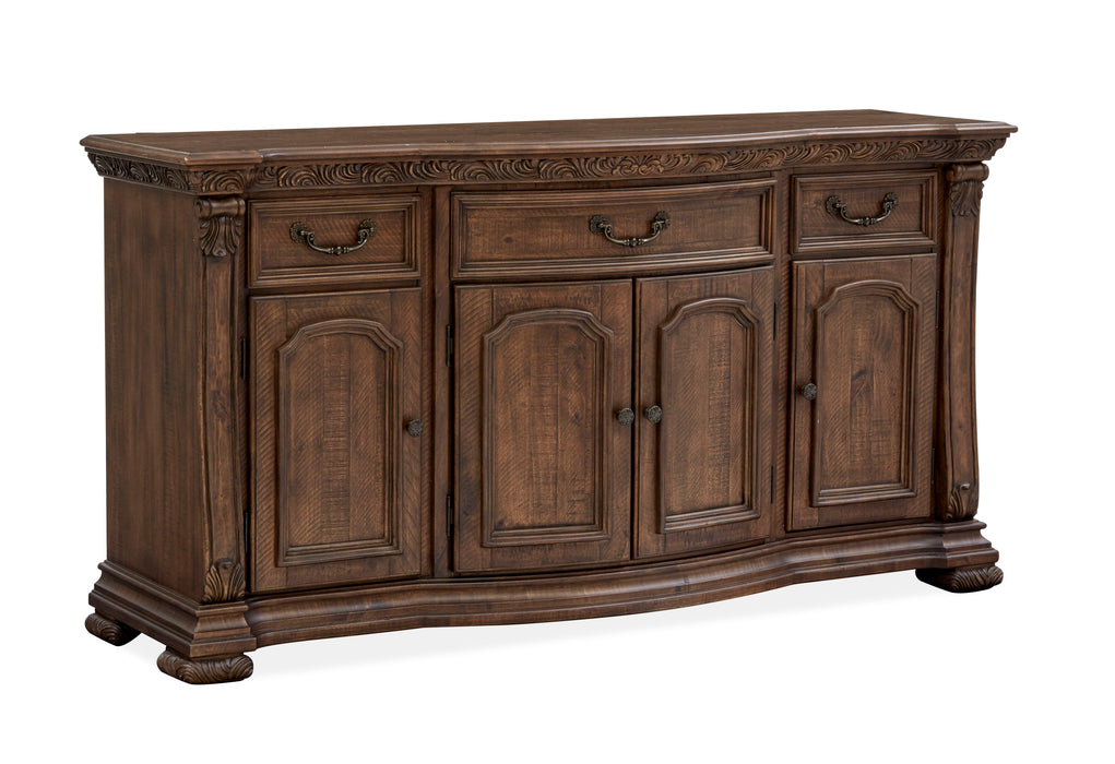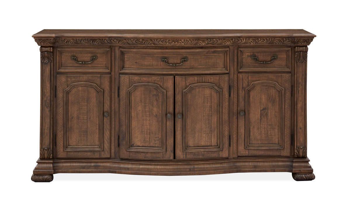 Grand yet casual, luxurious yet laid-back, Durango is an Old World-inspired traditional dining room collection that imparts a fresh allure to classic design. Reminiscent of garden gates, a recurring scroll work design element is featured throughout the collection. A beautiful Willadeene finish adores the classic hardware, metal scroll work, the metal stretcher with decorative rosettes on the trestle table.