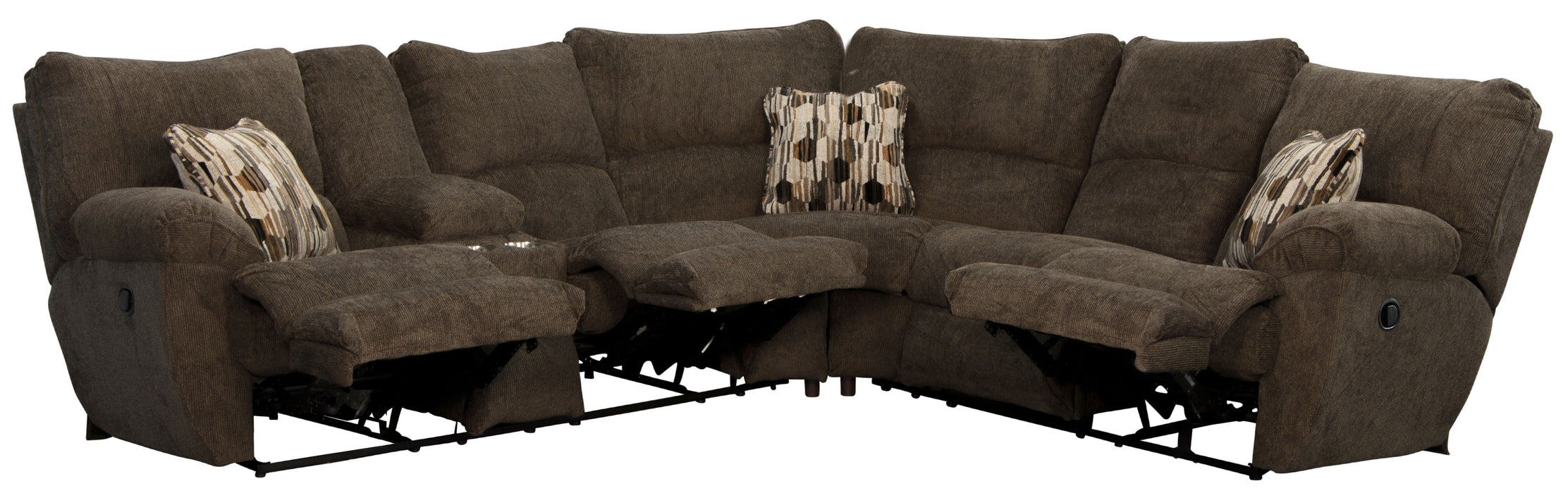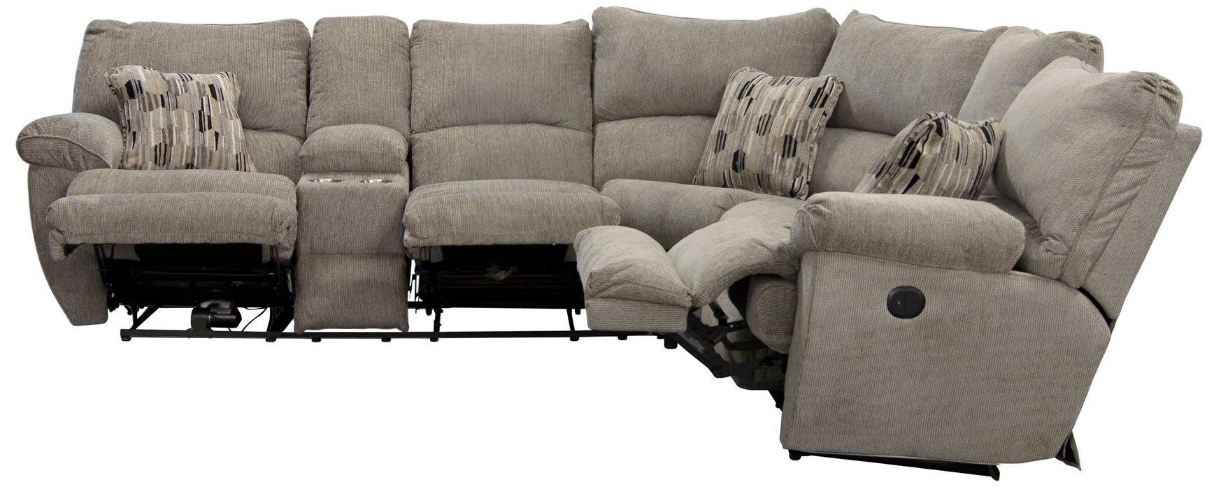 Experience the epitome of comfort and functionality with the Elliott sectional, covered in a soft polyester chenille fabric. Indulge in ultimate relaxation as you recline in one of three power reclining seats that offer personalized comfort at your fingertips. Each seat is constructed of individually pocketed coils encased in foam and topped with a layer of cool gel infused memory foam for the ultimate in seating comfort and consistency. Our sectional is not just about lounging – it's about convenience too. Discover a hidden storage console equipped with two convenient cup holders, ensuring your drinks and essentials are always within reach. But that's not all – we believe in style as much as substance. Three stylish accent pillows accompany this sectional, elevating your décor to the next level. Whether you're hosting friends, spending quality family time, or enjoying a quiet evening, our sectional combines comfort, convenience, and style effortlessly. Elevate your living space with an Elliott sectional that's designed to redefine the way you relax and entertain.