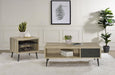 All the best elements of a retro design motif go modern in your updated living space. This wood end table fits beautifully in an easy-living family room or living room, or even as a casual bedroom nightstand. A square silhouette is tasteful and unusual, constructed of distressed pine finish engineered wood and rubberwood. A deep gray interior shelf separates space perfectly, leaving room for both tall and small items. Tapered rounded legs match its shelf, adding a nod to retro influence.