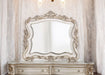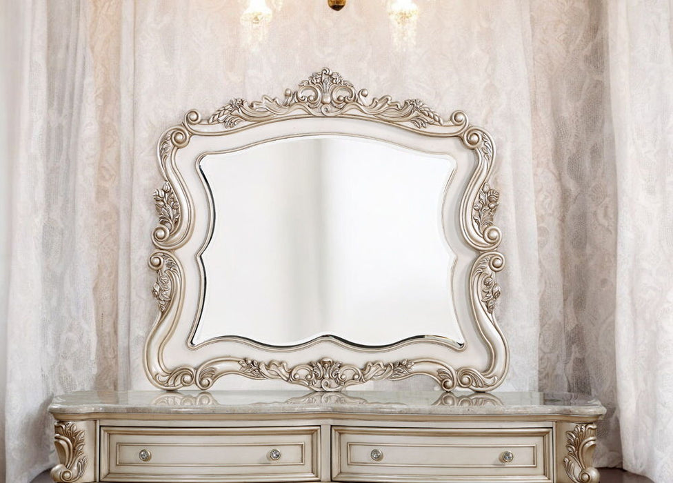 The Gorsedd dresser is exclusively designed and filled with romantic spirit. Expertly detailed, the mirror is crafted with romantic elements combining Queen Anne legs and ornate floral accents in matching golden ivory finish. Add glamorous French provincial charm with this uniquely designed collection that will make a statement in any bedroom