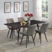 - Stylish and uniquely detailed, this leatherette dining chair is sure to impress.Scooped seating and plush padding create a supremely comfortable seat.Quilted detailing on the back lends a pleasing touch of texture.Cross stitched embellishments add even more eye-catching allure.Hairpin legs round out the design for an infusion of mid-century modern charm.
