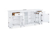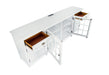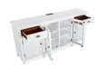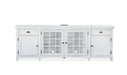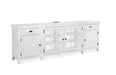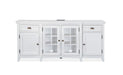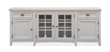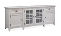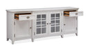 Heron Cove - Entertainment Console. 2 wood framed glass doors in the center. 2 adjustable Wood shelves behind the doors. 2 felt lined top side drawers. 1 adjustable Wood shelf behind each left and right wood door. Side mount ball bearing guides. Wire management. Set of power supply and USB charger.