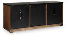 Double down on casual chic with the two-tone look of this credenza. With its finishes, it reflects your eye for modern design. The trend-right slatted styling on its doors brings added charm. And with the credenza's adjustable shelves, open storage and accessories drawer, keeping office essentials organized is a breeze.