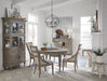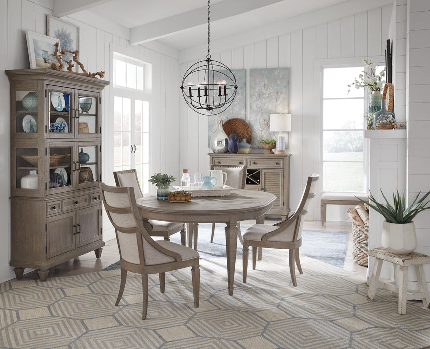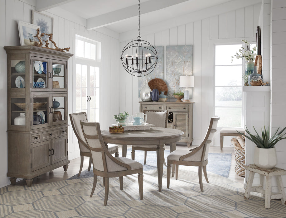 Inspired by inns and wineries in the Napa Valley, the Lancaster dining collection exudes the ambience of a laid-back resort. Crafted of high-low Pine and Hardwood Solids, the soft Dovetail Gray finish and Weathered Bronze hardware mix effortlessly with graceful turned legs and designer details to create a look that is distinctive yet inviting. Adding a casual classic and coastal flair, shutter wood doors are used on the server, and two shutter doors are also on the base of the counter table, with adjustable shelves behind. The distinctive piece selection includes a buffet, server and a dining cabinet with two wood-framed glass doors on the top and two on the bottom, offering 3-way touch lighting control with 2 LED lights. The table options include a 52-inch round and a 68-inch rectangular leg table. The tables can be extended to 70 inches and 86 inches, respectively, with use of a leaf. The rectangular counter table extends to 58W x 36H when the butterfly leaf is used. The versatile seating options include a side chair with upholstered seat and wood slat back, an upholstered seat and back chair, a bench with upholstered seat and wood trim, an elegant shaped chair with wood trim and upholstered seat and back, and counter-height dining chair with upholstered seat and slat back. Take a vacation without leaving home with the resort flavor created by the Lancaster dining collection.