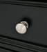 - Round metal drawer knobs with satin nickel-tone finish