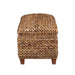 Bring warmth and functionality into your home with this hand-woven storage bench, crafted from natural banana leaf over a sturdy solid wood frame. Finished in rich amber tones, it blends rustic charm with modern country appeal. The woven texture adds organic detail, while the hinged lid lifts to reveal a spacious interior for blankets, pillows, or daily essentials. Elevated on tapered honey-finished legs, this versatile bench works beautifully at the foot of a bed, in an entryway, or as extra seating in a living space.