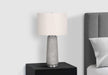 - Modern Design: Features a subtly textured grey resin cylinder base with polished silver metal footing and an ivory linen drum shade topped with a silver finial.