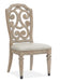 Rooted in Old World design with an updated and relaxed soft Fawn finish, it's hard to surpass the appeal of the elegant Marisol dining collection. Reminiscent of garden gates, a recurring design element is metal fretwork in a graphite finish on case doors and scrolled metal decoration on the hutch, dining curio and the pedestal base of the 65-inch round dining table. Crafted of Pine Solids, timeless and gracious style elements include fluted pilasters, intricate carvings, a shaped foot and dramatic arch shapes on the curio, hutch and huntboard. Three stunning dining case pieces are offered including a buffet curio, buffet with hutch and a huntboard top featuring diagonal planking behind the 3 wood shelves with plate grooves. The three dining tables include a rectangular table, trestle table with a bottom metal stretcher with rosette decorations and the 56-in round table with metal scrolls on the pedestal base. Dining side chairs include two upholstered-seat chairs, one with a wood fretwork back and one with an upholstered back. Beautifully-scaled host chairs in a classic upholstered wing style are offered with a leg or skirt option. Elevate your interiors with the refined style of Marisol.