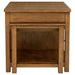 Designed with everyday flexibility in mind, this kitchen island combines storage, seating, and workspace in a single, streamlined footprint. Ten drawers with dark grey pulls keep utensils and tools close at hand, while a spacious open shelf adds room for bulkier items. A pull-out extension table slides smoothly from the side, transforming the island into a meal prep zone or dining spot. Two backless stools store discreetly underneath on built-in stemware-style supports, blending function with rustic charm in a warm dark oak finish.