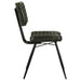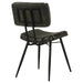 Blending industrial edge with vintage charm, this dining side chair is a striking addition to any dining space. Upholstered in hand-dyed genuine goat leather, the padded seat and backrest offer both comfort and durability. Vertical tufting details enhance texture and create a refined look, while the flared and tapered metal legs in a deep black finish provide sturdy support with a sleek contrast. Designed for long-lasting appeal, this chair brings a sophisticated yet rugged aesthetic to modern, industrial, or rustic interiors.