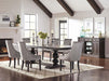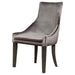 Bring romance and sophisticated style to a transitional space. Elegance abounds in this everyday dining chair that hints at a formal motif. Luscious grey upholstery offers cool tones and a versatile palette. Dark charcoal finish wood legs echo a charming retro style with graceful curving on the two back legs and tapered front legs. Experience superior comfort in a padded seat and sloped, molded base.