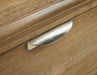 This TV stand's classic yet contemporary good looks are hard to deny. Softly shaped posts with a light oak finish and wire-brushed wood grain texture lend an organic appeal to your entertainment space. Roomy drawers are just the ticket for extra media storage and keeping day-to-day clutter at bay, while the shelf is ideal for fashionable display pieces.