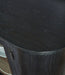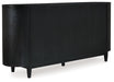 Inspired by art deco design, this dining server makes a lasting impression in a simply stunning way. Its magnificent rounded silhouette is enhanced with a rich layered black finish on the textured wood grain surface. Complete with glass cabinet doors, interior shelving and tapered legs, it’s the contemporary statement piece you’ve been seeking to elevate late-night dinners and full-on family feasts.