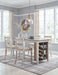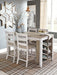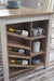 This counter height table with storage invites you to raise the bar on small space living. An inspired choice for coastal chic or modern farmhouse settings, this clean-lined, simply striking table doubles the charm with a brown tone top with plank effect, paired with a grayish white base with rub through effect for timeworn appeal. Built-in 8-bottle wine rack and pair of open shelves make the most of every inch of space.