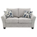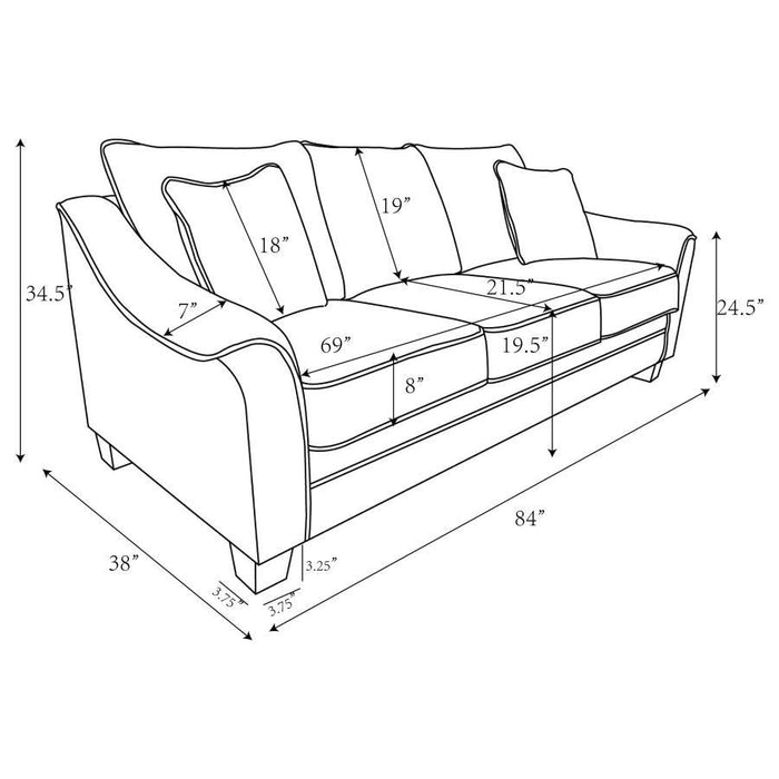 Geometric accent pillows add the perfect pop of pizzazz to a two-piece modern sofa set. Ideal for a stylish but approachable living room, the set features clean lines with sloping arms that add a hint of movement. Light gray upholstery complements in a contemporary space, while plush foam cushions are complemented with sinuous springs and pocket coils for exceptional support. The sofa and loveseat feature piped trim, adding to their tailored appeal. Tapered block feet in a finish complete the look and offer stability and durability.