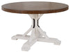 If you love rustic details full of charm and character, this dining room table is made with you in mind. Its two-tone distressed finish pairs a rustic brown tabletop with a vintage white base for fresh farmhouse styling. This round table features a sturdy post and bracket base design, with black metal accents and a thick dining top that lends an earthy appeal.