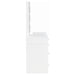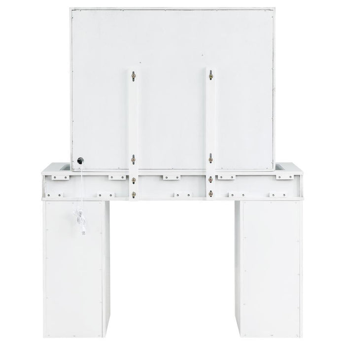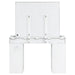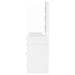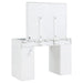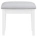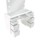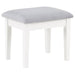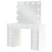 Pull out all the stops to set up a stylish and functional space for your makeup and prep, adding this three-piece white finish vanity set to a modern bedroom. Wood products construction with mirrored drawer fronts and a gray upholstered stool cushion team up to maintain an easy palette with versatility. Find space in nine drawers to stash implements, cosmetics, and accessories. Charming crystal knobs and a felt-lined top drawer add to a list of fab features. The marquee element of this set is a mirror surrounded with bulbs to offer helpful lighting as it enhances a chic design.