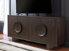 Sleek. Striking. Sculptural. This accent cabinet refines the art of functional fashion. Outfitted in a luxe dark brown finish, it’s an apt addition to contemporary entryways or dining areas. Its distinctive linear profile is beautifully contrasted by the curves of the oversized round legs and circular door pulls. Elevate your entertainment space when you stage this cabinet as a TV stand—openings in the back keep cords and cables organized for a clean, neat look.