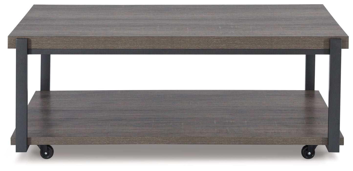 A cohesive, casual contemporary ensemble. This table set is equal parts sleek form and routine practicality. If you're hosting guests or need space to stretch out in a recliner, rolling casters on the coffee table clear up extra floor space in a snap. Each table is outfitted with a lower shelf for chic storage and displaying decor.