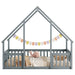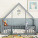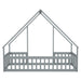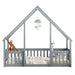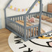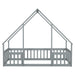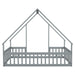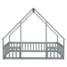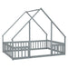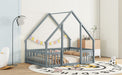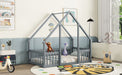 Full Wood House-Shaped Floor Bed With Fence, Guardrails - Gray