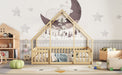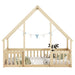 Wood House-Shaped Floor Bed With Fence, Guardrails